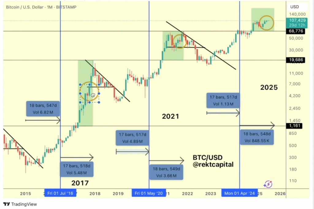Rekt Capital analizuje rynek bitcoina od lat. W swojej najnowszej analizie porównuje obecny cykl z latami 2017 i 2021. W obu przypadkach szczyt cenowy przypadał około 550 dni po halvingu. Jeśli historia się powtórzy, bitcoin osiągnie swój szczyt właśnie w październiku.