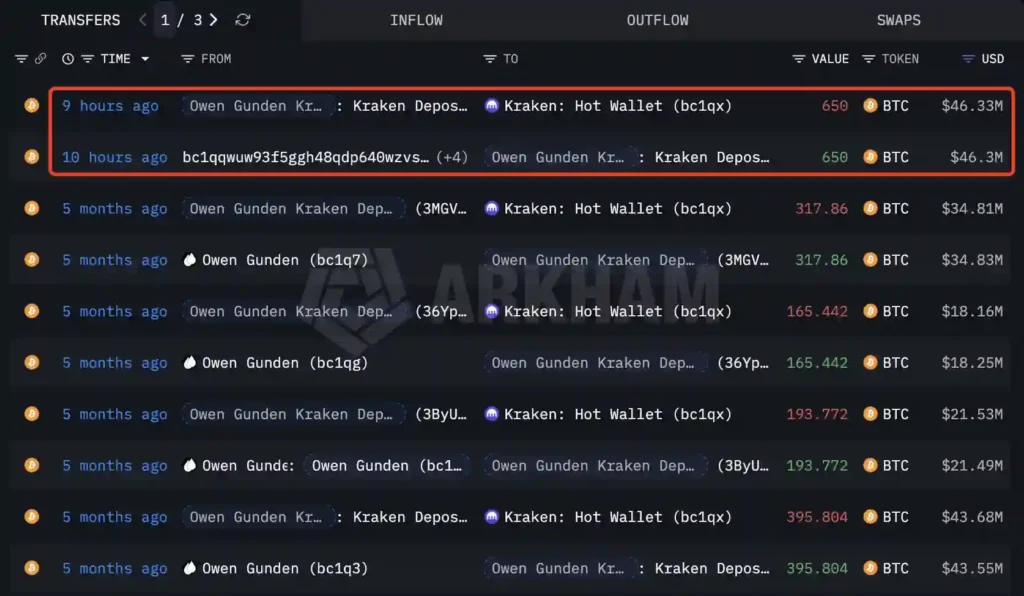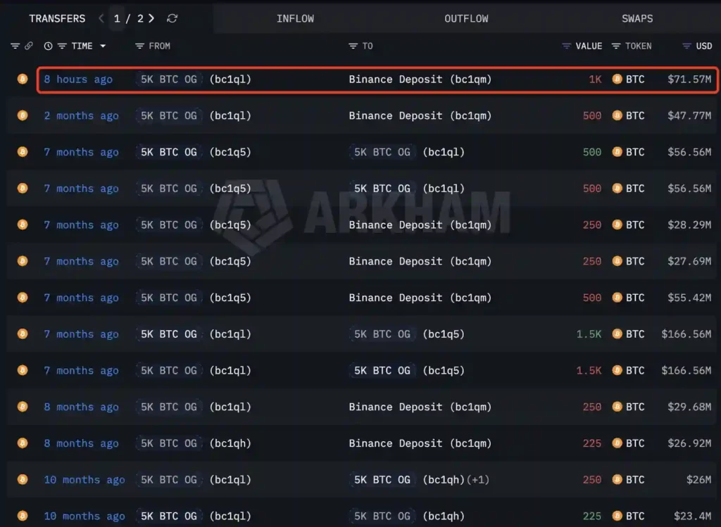Najstarsi inwestorzy, określani w środowisku mianem Bitcoin OG, zaczęli masowo wyprzedawać swoje portfele po tym, jak jastrzębie sygnały z Fed skutecznie ostudziły nadzieje na szybkie obniżki stóp procentowych. Tylko dziś rano co najmniej dwóch wieloletnich posiadaczy upłynniło ponad 1650 Bitcoinów o łącznej wartości przekraczającej 117 mln USD. Jeden z weteranów rynku, który w przeszłości pozbył się już 11 000 Bitcoinów, dorzucił do swojej sprzedaży kolejne 650 BTC.