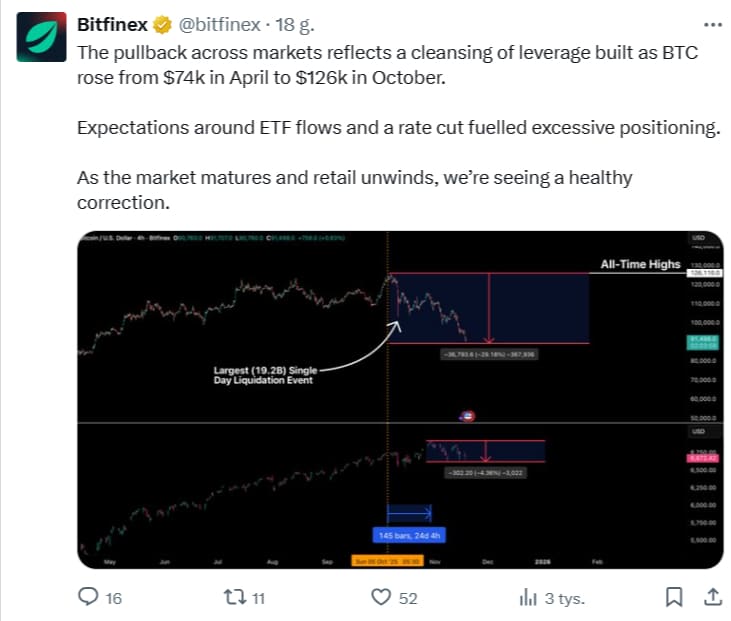 Analitycy z Bitfinex są zdania, że najgorsza faza korekty Bitcoina może zbliżać się do końca. Ich zdaniem „czuć, że nadszedł czas, aby stosunkowo wkrótce ustalić lokalne dno”. Zwracają uwagę, że w wielu historycznych cyklach trwałe dna formowały się dopiero po kapitulacji krótkoterminowych posiadaczy i poniesieniu przez nich strat. Zespół Bitfinex zauważa również, że presja sprzedażowa zaczyna słabnąć, a po jednej z najostrzejszych korekt cyklu widać „wczesne oznaki stabilizacji”.