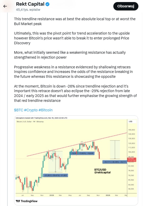 Analitycy z firmy płatniczej B2BINPAY podzielają ten pogląd, twierdząc, że „trwałe ożywienie może uformować się równie szybko”. Jako pierwszy znaczący opór wskazują pasmo 97 000 – 100 000 USD. Dopóki Bitcoin nie podejmie próby odzyskania tego poziomu, sentyment na rynku najprawdopodobniej pozostanie defensywny.