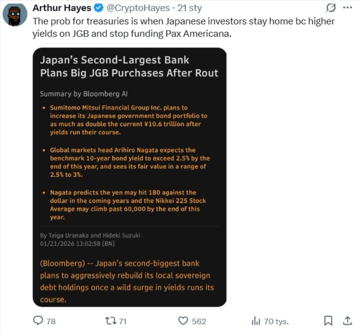 Mimo chwilowego oddechu analitycy ostrzegają przed hurraoptymizmem. Eksperci z serwisu X.com zwracają uwagę, że fundamenty obecnego spokoju są kruche. Arthur Hayes, współzałożyciel giełdy BitMEX, w swoich wpisach wielokrotnie podkreślał, że polityka Banku Japonii jest kluczowa dla ceny Bitcoina. Jego zdaniem wszelkie próby ratowania rynku obligacji przez dodruk pieniądza w dłuższej perspektywie będą napędzać wzrosty kryptowalut.