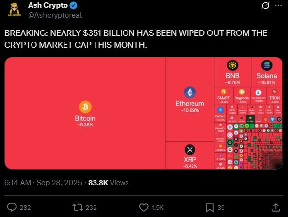 Jak wynika z najnowszych danych, w cały miesiącu rynek kryptowalut zanotował ogromny spadek kapitału. Ash Crypto, popularny analityk rynków finansowych, w jednym z ostatnich postów na X, poinformował, że w całym wrześniu z giełd kryptowalut wyparowało łącznie aż 351 mld dolarów, a straty notowały niemalże wszystkie topowe projekty.