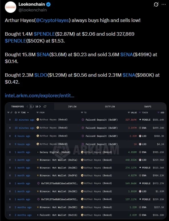 Hayes często chwali się swoimi złotymi strzałami, ale rzeczywistość nie jest taka kolorowa, jaką przedstawia nam słynny trader i ekspert. Platforma Lookonchain przyjrzała się bliżej jego portfelowi i wykryła kilka wpadek. Wniosek platformy po analizie jest jeden: „Arthur Hayes zawsze kupuje drogo i sprzedaje tanio!”.