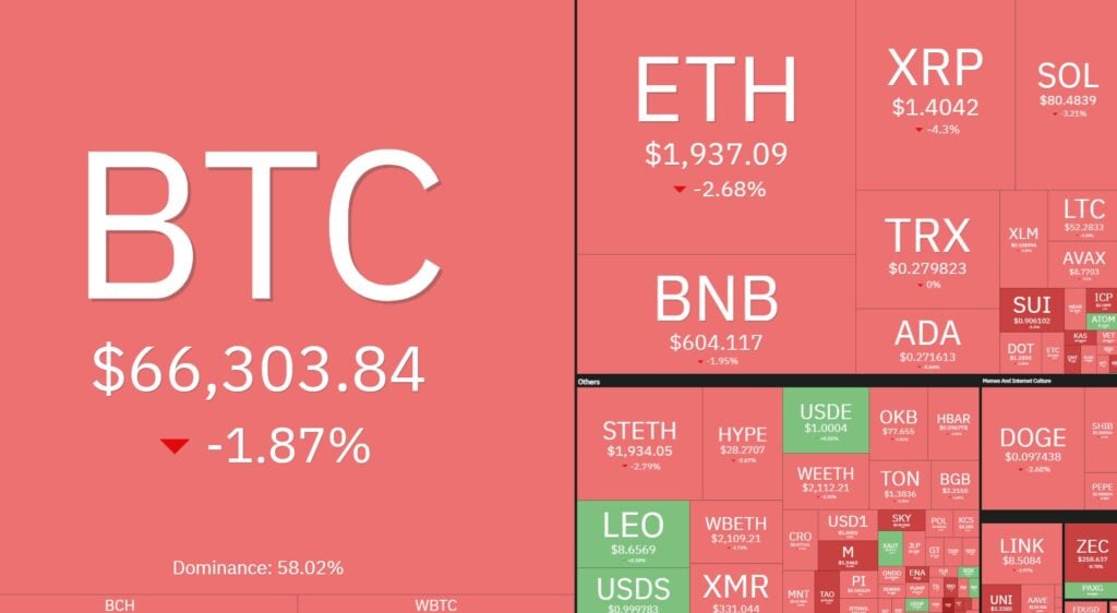 Kryptowaluty i cały rynek z nimi powiązany ponownie znalazł się w defensywie. Bitcoin spadł poniżej 66 000 USD, by następnie odbić w okolice 67 000 USD, ale wciąż pozostaje pod presją sprzedających. Całkowita kapitalizacja rynku skurczyła się o kolejne 50 mld USD, a dominacja BTC osuwa się poniżej 56,5%.