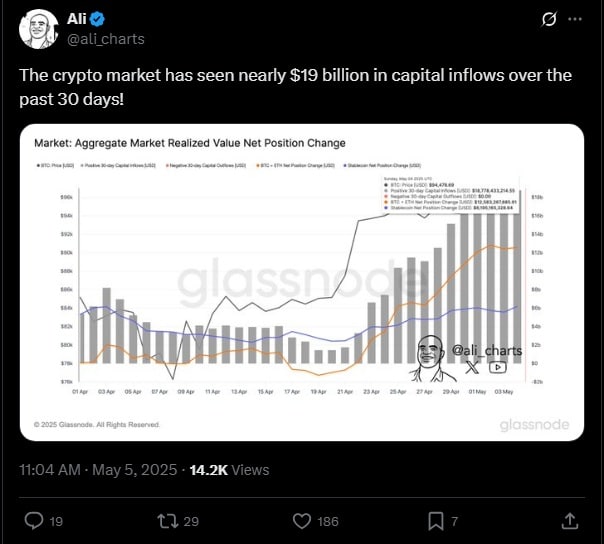 Co może wydarzyć się dalej? Odpowiedź na tak specyficznym rynku, jakim są kryptowaluty, nigdy nie jest prosta i oczywista. Jednak kilka sygnałów daje szansę na kontynuację trendu wzrostowego. Optymizmem napawają m.in. ustalenia dotyczące napływu kapitału, które przedstawił Ali Martinez. Popularny na X ekspert przedstawił podsumowanie za ostatni miesiąc, z którego wynika, że kapitalizacja kryptowalut wzrosła o prawie 19 mld dolarów.
