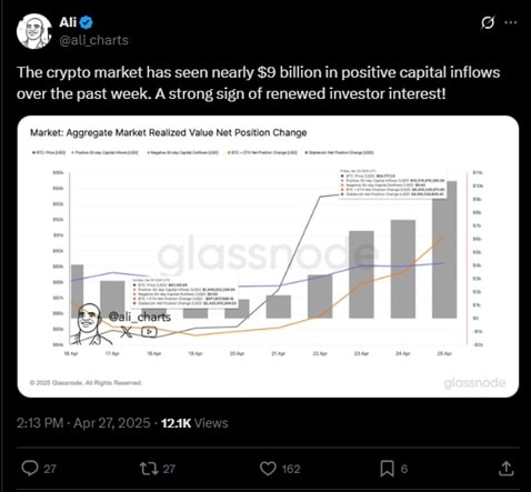 Zyskał nie tylko Bitcoin, ale również pozostałe kryptowaluty. Jak ustalił Ali Martinez, na rynek napłynęły ogromne środki. W jednym z najnowszych wpisów na X popularny ekspert poinformował, że rynek kryptowalut odnotował prawie 9 miliardów dolarów dodatniego napływu kapitału w ciągu ostatniego tygodnia. Jak ocenił Martinez, to „silny znak odnowionego zainteresowania inwestorów”.