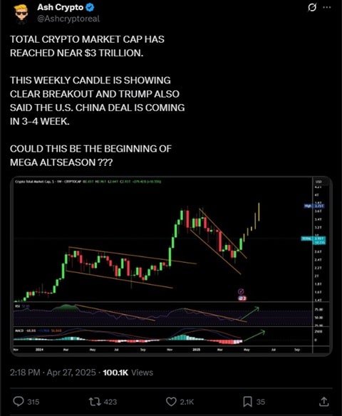 Wśród nich jest Ash Crypto. Popularny influencer kryptowalutowy zwrócił uwagę na fakt, że optymizm, który powrócił na rynek, spowodował wzrost całkowitej kapitalizacji rynku do 3 bilionów dolarów. Wykres, który dołączył do wiadomośc,i ma być dowodem na wybicie.