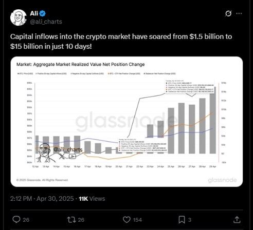 Jak ustalił Ali Martinez, w ciągu ostatnich 10 dni napływ kapitału na rynek kryptowalut wzrósł z 1,5 miliarda dolarów do 15 miliardów dolarów. Ekspert ocenił, że to „silny znak odnowionego zainteresowania inwestorów”. To bardzo ważna i optymistyczna wiadomość. Jednak to, co pozytywnie zaskakuje, to fakt, że wśród kupujących są też duże instytucje, które pomimo zmiany otoczenia wciąż nie są kojarzeni rynkiem aktywów cyfrowych.
