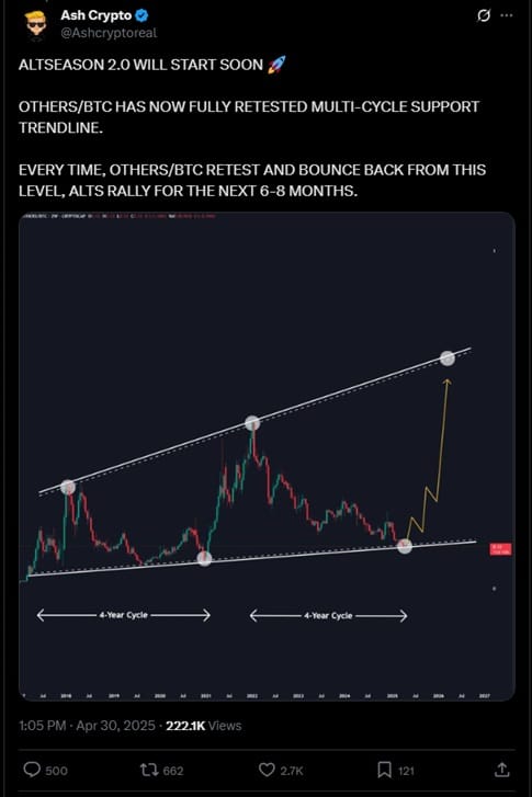 Wydaje się, że jednak większość analityków oczekuje kolejnego sezonu tokenów alternatywnych. Wśród nich jest m.in. Ash Crypto. Ekspert w jednym z ostatnich postów na X przedstawił analizę, z które wynika, że kryptowaluty przetestowały wielocyklową linię trendu wsparcia. Influencer zauważył, że w przeszłości gdy miała miejsce podobna sytuacja startował kolejny sezon na altcoiny, który trwał od 6 do 8 miesięcy.