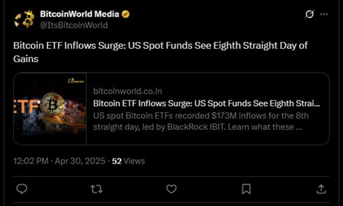 W tym samym czasie na nowo zainteresowanie zyskały również fundusze spotowe powiązane z Bitcoinem. i Ethereum. Według danych, które opublikowała platforma Lookonchain, 30 kwietnia nastąpił znaczny napływ netto do głównych ETF-ów kryptowalutowych. Fundusze spotowe BTC ETF odnotowało napływ netto w wysokości około 127,53 mln dolarów. Prym w tej grupie wiódł iShares (Blackrock), który sam odnotował napływ netto w wysokości około 212,11 mln USD).