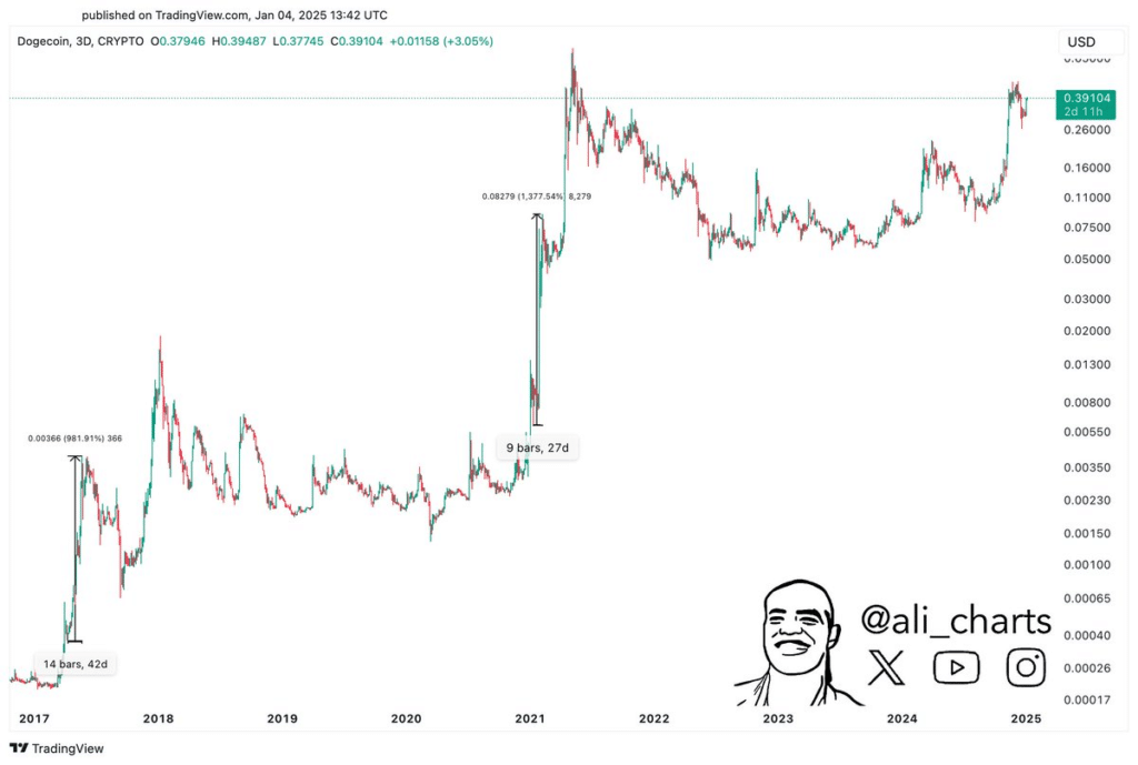 Dogecoin (DOGE) w poprzednich okresach hossy wykazywał szybkie wzrosty cen. W ciągu zaledwie 27 do 42 dni zdołał on podskoczyć o 1000%. Obecnie wyceniany na 0,3867$, w ciągu ostatniego tygodnia DOGE podrożał o 22,1%, a jego kapitalizacja rynkowa wynosi obecnie 57,018 mld dolarów. Jeśli Dogecoin powtórzy swój sukces z przeszłości, jego cena może wzrosnąć z 0,3867$ do 3,867$, co będzie ważnym kamieniem milowym dla tej znanej kryptowaluty.