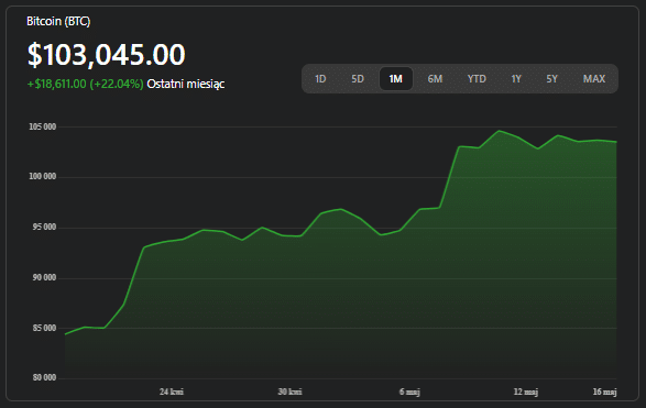 Wbrew pozorom nie jest to znak słabości: przepływy do amerykańskich funduszy ETF-spot znów przybrały na sile (sam 14 maja przyniósł 319 mln USD nowego kapitału), a największe firmy zarządzające aktywami stale zwiększają swoją ekspozycję – przynajmniej taki obraz wyłania się z najnowszych danych z rynku regulowanego. Przy takiej kombinacji makra i płynności powrót cen do kluczowych średnich kroczących jawi się bardziej jako okazja do uzupełnienia pozycji niż początek głębszej bessy.
