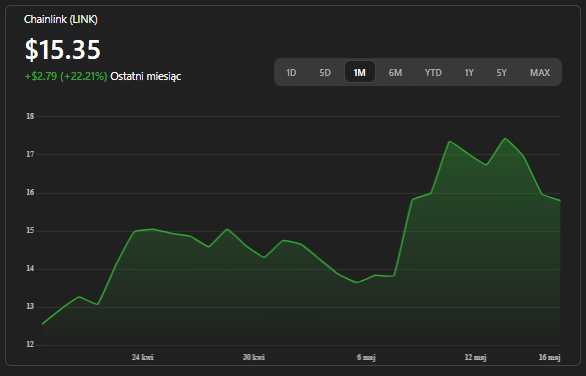 Chainlink wyrasta na infrastrukturalny „pick-and-shovel” w popularnym temacie tokenizacji aktywów. Partnerstwo ogłoszone 15 maja z JP Morgan Kinexys i Ondo Finance pokazuje, że instytucje przenoszą koncepcję RWA z laboratorium do rzeczywistego obiegu płatności. Przy cenie 15,3 USD – dziesięć procent poniżej lokalnego szczytu – widać potencjał na dalszą akumulację, o ile utrzymamy się powyżej 14 USD.