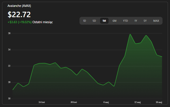 Na koniec Avalanche, które w czasach prymatu „narracji” bywa często pomijane. Protokół stale przyciąga przyciąga nowe studia gamingowe – ostatnio na przykład kultowe MapleStory Universe buduje własny subnet właśnie na AVAX. Cena 22–23 USD odzwierciedla wzmożoną zmienność, ale każde utrzymanie średniej 20-dniowej ok. 22,7 USD zwiększa szansę na powrót w rejony 28–32 USD przy rotującym kapitale altsezonu.