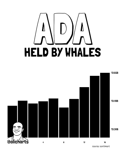 Technik rynkowy Ali Martinez dostrzegł, że wieloryby zgromadziły 210 milionów tokenów ADA w ciągu ostatnich trzech tygodni. Przejęcie Cardano miało miejsce w pierwszym tygodniu roku, a wieloryby nie zwolniły tempa.własny, kupując token pomimo niepewności.