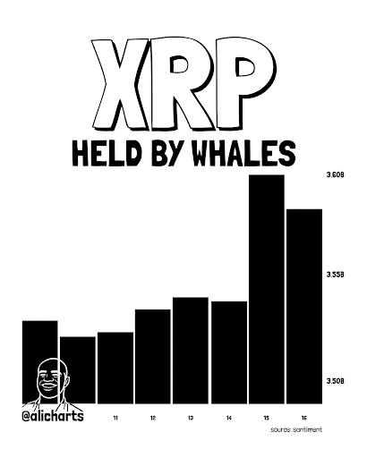 XRP, piąta co do wielkości kryptowaluta pod względem kapitalizacji rynkowej, jest jedną z kryptowalut, które gromadzą wieloryby. Martinez wskazał na dane Santiment, które pokazują, że duzi posiadacze tokenów kupili w zeszłym tygodniu 50 milionów tokenów XRP (100 milionów dolarów).