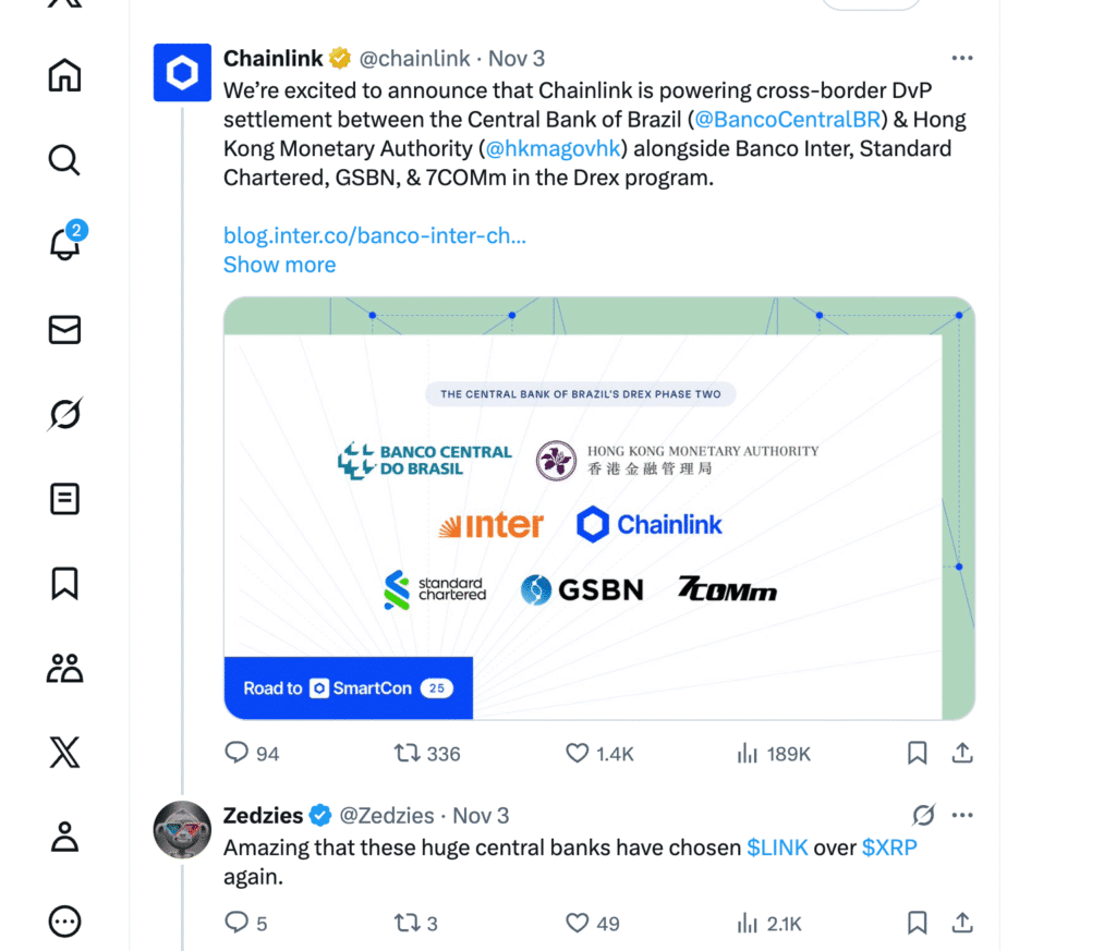 Te uwagi ożywiły trwającą debatę na temat adopcji instytucjonalnej. Wielu obserwatorów zauważyło, że banki centralne i sieci finansowe coraz bardziej preferują rozwiązania interoperacyjne, takie jak Chainlink CCIP, podczas gdy XRP Ledger (XRPL) – niegdyś reklamowany jako aktywo na rynku transgranicznym – wydaje się być marginalizowany.