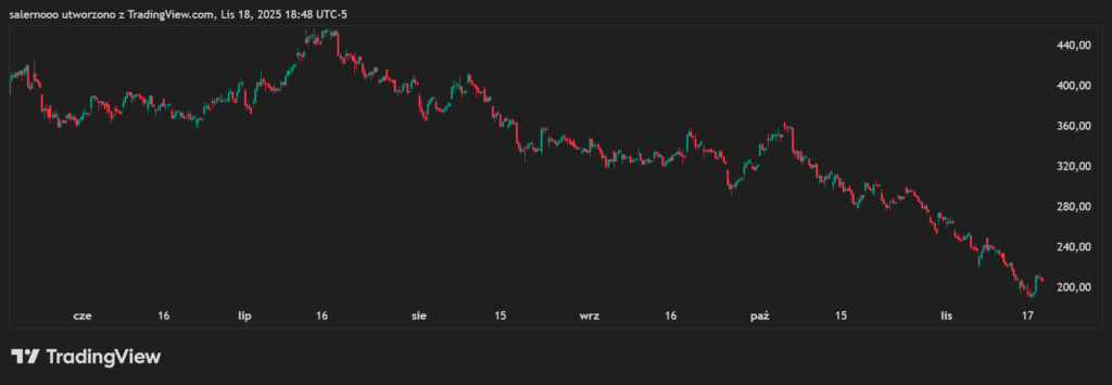 Nie trzeba być wybitnym matematykiem. To oznacza jedno: sam spadek kursu MSTR wymazał ponad 4,1 miliarda dolarów z wartości jego udziałów. W tym czasie akcje Strategy poleciały w dół aż o 52%, wracając do poziomów sprzed najgorętszej fazy hossy na Bitcoinie. Rynek zaczął je wyceniać… poniżej wartości samego firmowego skarbca BTC. To zaprzecza statusowi spółki „Bitcoin premium”, którą MSTR cieszyło się przez ostatnie lata.