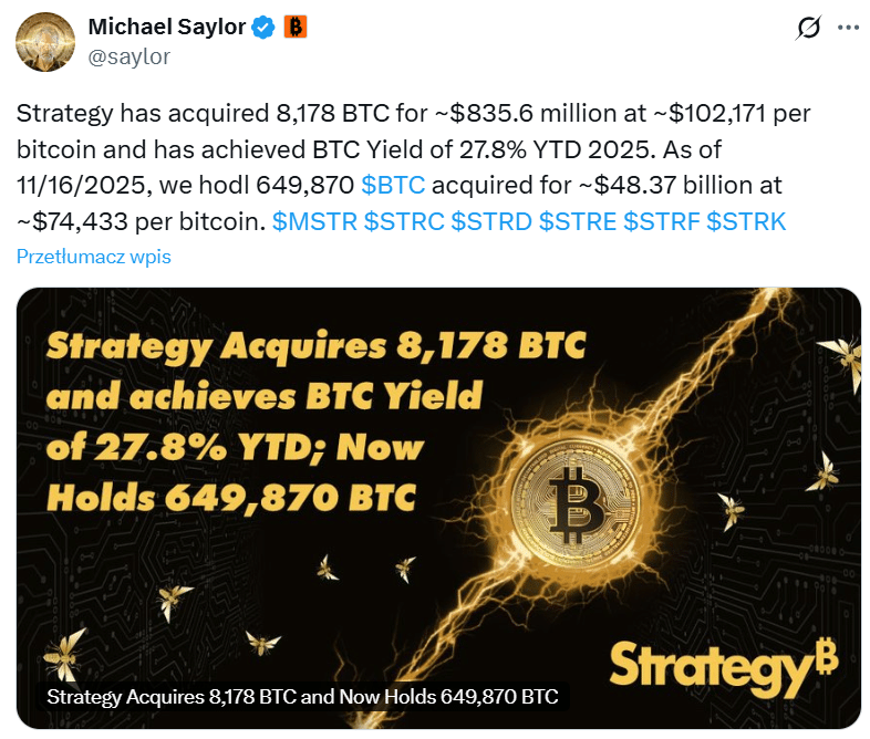 Co ciekawe, firma twardo stoi przy swoim i wychodzi naprzeciw trendowi. 17 listopada Strategy zgłosiło, że kupiło 8178 BTC za 835 mln USD. To ich najpokaźniejszy zakup od lipca. Skarbiec Strategy ma już 649 870 BTC o wartości ponad 59 miliardów dolarów. Średnia cena zakupu? 74 433 dolarów. To oznacza, że spółka kontroluje 3,1% całego przyszłego supply Bitcoina. Rynek spada, nerwy szarpią inwestorów, a Saylor i jego ekipa dalej kupują.