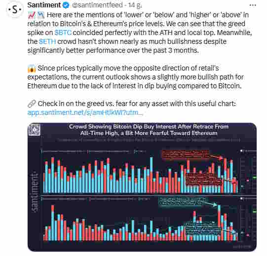Jak czytamy w raporcie opracowanym przez analityków Santiment, aktywność w mediach społecznościowych wokół Ethereum jest znacznie mniej „przegrzana” niż w przypadku Bitcoina. W poście opublikowanym wczoraj na platformie X Santiment zwrócił uwagę, że pomimo znacznie lepszych wyników Ethereum w ciągu ostatnich trzech miesięcy, społeczność ETH nie wykazuje tak dużej euforii. Jest to widoczne w notowaniach stosunku ETH/BTC, który mierzy siłę Ethereum w relacji do Bitcoina i wzrósł o 32,90 proc. w ciągu ostatnich 30 dni.