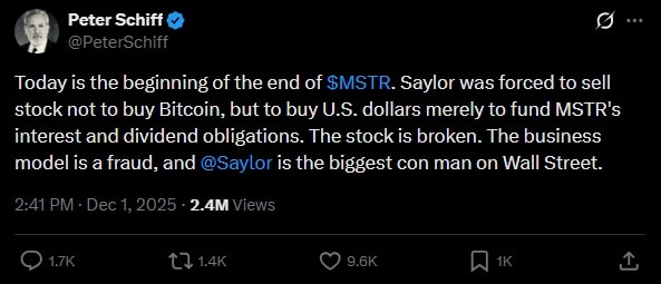 Jednak Peter Schiff sugeruje, by uważać na Saylora. W kilku postach na X poświęconych MSTR ekonomista stwierdził, że MicorStrategy oszukuje rynek, ponieważ sprzedaje akcje nie po to, by kupić kolejne BTC, tylko po to, by sfinansować odsetki i zobowiązania dywidendowe MSTR.