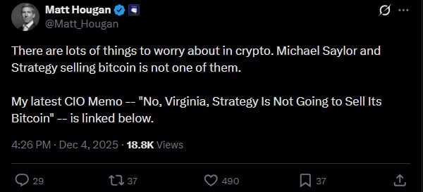 Jednak Matt Hougan, CTO Bitwise, ocenia, że MicroStrategy jest w dobrej kondycji i nawet dalsze spadki nie zmuszą ich do sprzedaży Bitcoina. Hougan wskazuje, że spółka ma około 1,4 mld dolarów gotówki oraz nie ma żadnych istotnych długów. Dlatego ekspert prognozuje, że sprzedaż jest mało prawdopodobna. Jak napisał w na X, „Jest wiele rzeczy, o które trzeba się martwić w kryptowalutach. Michael Saylor i MicroStrategy nie jedną z nich”.