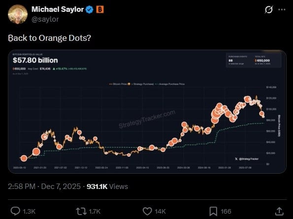 Michael Saylor ostatnim, który się nie złamał? Na razie MicroStrategy regularnie kupuje na spadkach, a ostatnia wiadomość Saylora na X sugeruje, że kolejne zakupy już niebawem. Kilka godzin temu słynny bitcoinera opublikował wiadomość o treści: „₿ack to Orange Dots?”. Do wiadomości dołączył charakterystyczny wykres z pomarańczowymi kropkami. O co tutaj chodzi? Osoby, które obserwują profil Saylora wiedzą, że zazwyczaj w ten sposób CEO MicroStrategy zapowiada, że szykuje się do kolejnych zakupów Bitcoina.