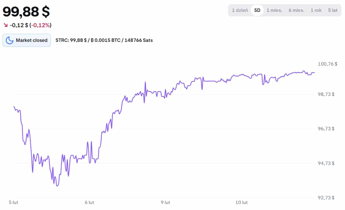 Akcje uprzywilejowane typu perpetual o nazwie Stretch oznaczone symbolem STRC powróciły do swojej wartości nominalnej wynoszącej 100 USD. Jest to istotny moment dla korporacji ponieważ odzyskanie tego poziomu cenowego pozwala firmie na wznowienie ofert typu at the market mających na celu pozyskanie kapitału na kolejne zakupy Bitcoin. Poprzednio instrument ten znajdował się na tak wysokim poziomie w połowie stycznia bieżącego roku gdy cena Bitcoin oscylowała w granicach 97 000 USD.