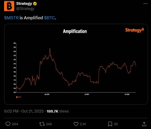 Na początku tygodnia ważny sygnał wysłała MicroStrategy. Spółka poinformowała 20 października na X, że nabyła 168 Bitcoinów, za około 112 tys. USD za sztukę. Po tych zakupach, na dzień 19 października 2025 r., spółka posiad 640 418 BTC. Na wszystkie token gigant wydał łącznie 47,40 mld USD. Średnia cena, za jaką MSTR nabyła każdego Bitcoina to 74 010 USD.
