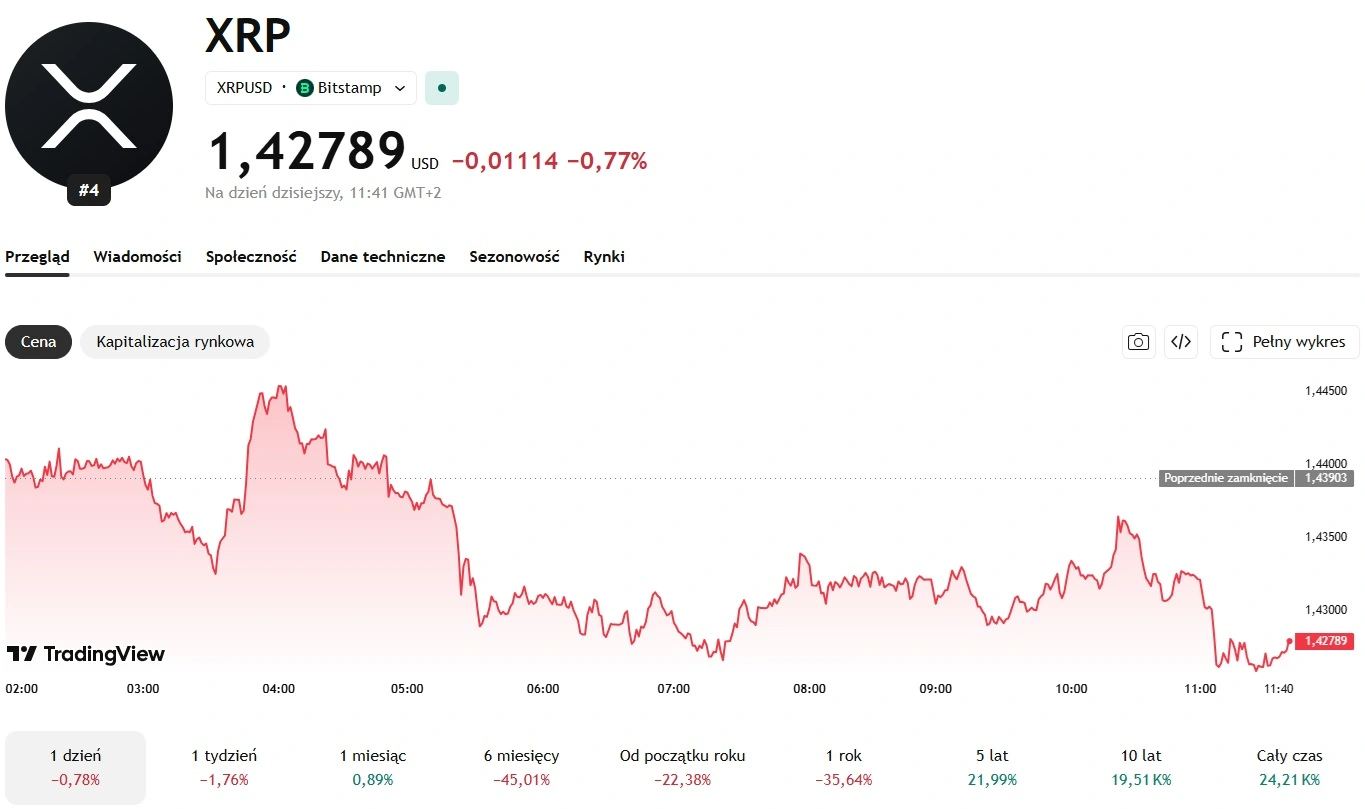 Mocne wskaźniki dotyczące liczby nowych portfeli w sieci Ripple wyglądają zaskakująco, jeśli weźmiemy pod uwagę miejsce, w jakim aktualnie znajduje się token. W chwili pisania tekstu XRP kosztuje 1,42 USD, a w ciągu ostatnich 24 godzin spadł o niespełna 1%. W ujęciu tygodniowym token traci na wartości około 2%. Z kolei w ciągu ostatniego miesiąca zyskuje niecały 1 % (0,89%). Tylko od początku roku (Year To Date) altcoin stracił na wartości 22,38%.