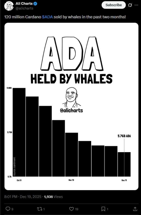 Ali Martinez opublikował najnowsze dane dotyczące aktywności wielorybów wokół Cardano i nie są one zbyt optymistyczne. W jednym z najnowszych postów na X Martinez poinformował, że wieloryby w ciągu ostatnich dówch miesięcy sprzedały aż 120 mln sztuk ADA. Dane, które rozpowszechnił ekspert pochodzą z renomowanej platformy analitycznej „Santiment”.