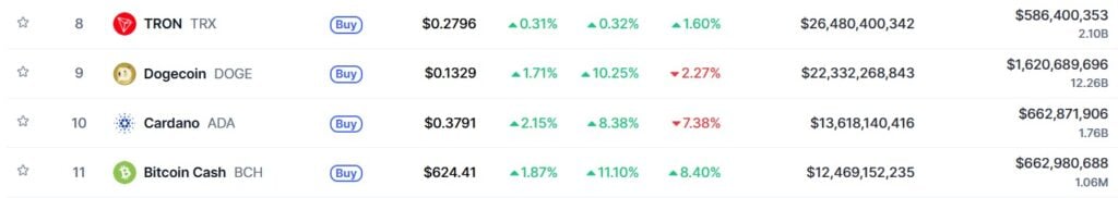 Kilka czynników może zadecydować o tym, że za moment Cardano wyleci z TOP 10. Rywal, który jest tuż za plecami, jest hitem ostatnich tygodni i rośnie mimo kryzysu. BCH tylko wczoraj zyskał ponad 10%. Natomiast w ujęciu tygodniowym i miesięcznym wzrósł odpowiednio o 8,49% oraz 19,15%. Przez ostatnie pół roku wzmocnił się o ponad 30%. A to nie jedyny sygnał zwiastujący możliwą zamianę miejsc.