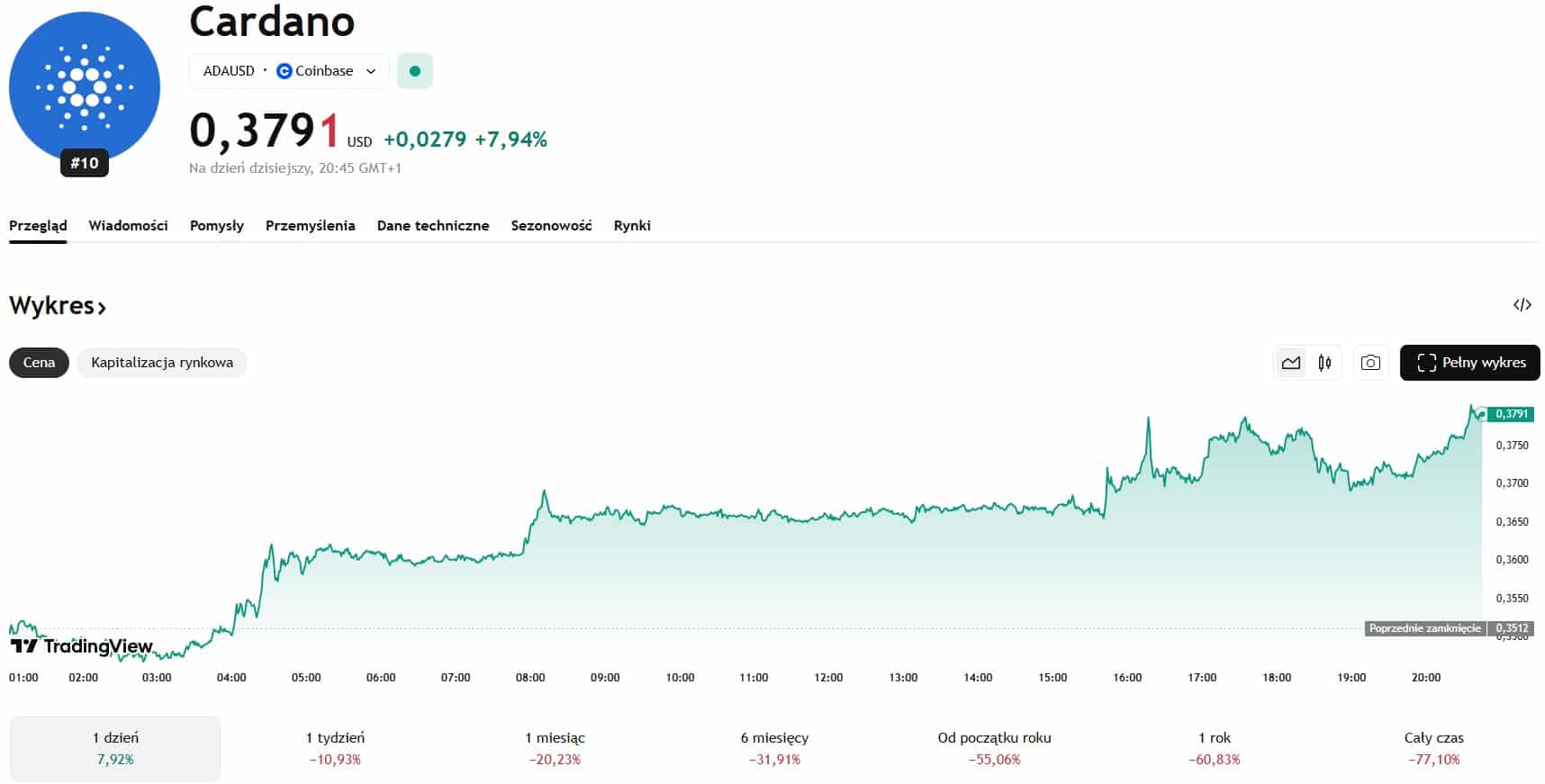 W chwili pisania tekstu popularny altcoin kosztuje 0,37 USD, a w ciągu ostatniej doby sporo odrobił. W ujęciu 24-godzinnym moneta wzrosła o prawie 8 %. Jednak zarówno w ujęciu tygodniowym, jak i miesięcznym token spadł odpowiednio o 10,92% oraz 20,23%. Mocno w dół poleciał też wskaźnik YTD (Year To Date). Od początku roku Cardano traci na wartości 55,06%. Tylko przez ostatnie pół roku token stracił ponad 30%.
