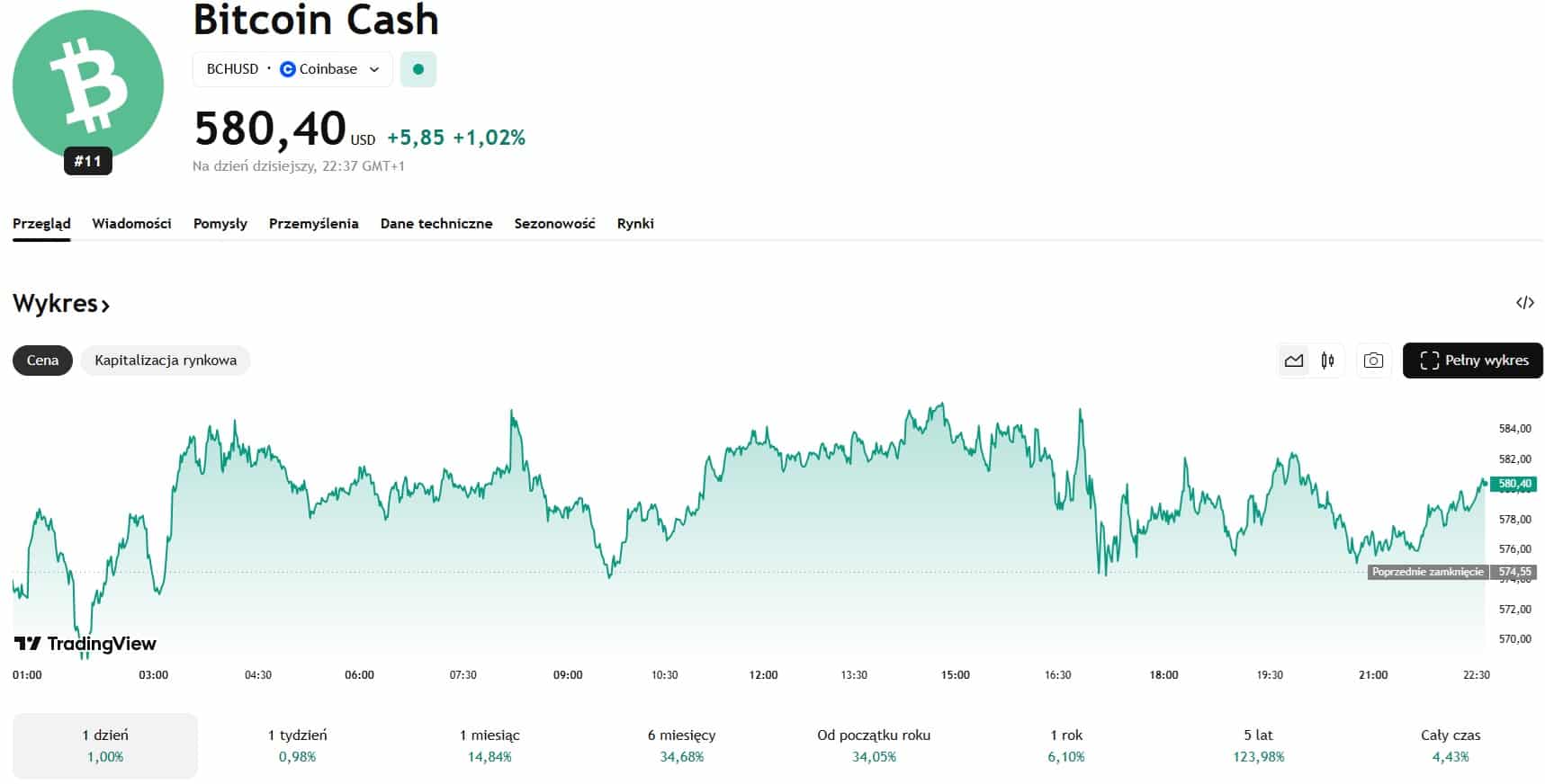 W chwili pisania tekstu BCH kosztuje 580 dolarów. Zarówno w ujęciu 24-gdodzinnym, jak i tygodniowym, token nie wykonał żadnego istotnego ruchu. W obu przypadkach rósł o około 1%. Z kolei w ujęciu miesięcznym token wzrósł o 14,84%. Na tle konkurencji altcoin ma bardzo dobry wskaźnik YTD (Year To Date). Od początku roku moneta zyskała na wartości około 34%.