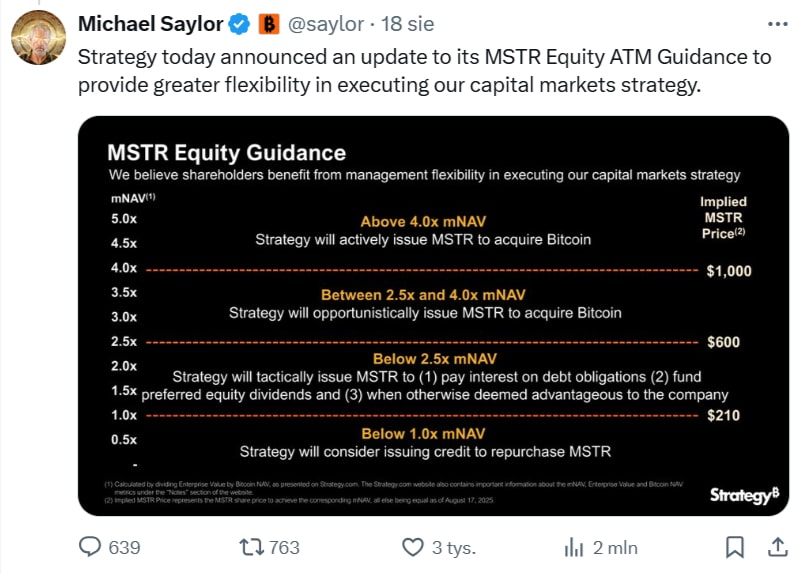 Zgodnie z nowymi wytycznymi, jeśli mNAV spadnie poniżej 2,5, Strategy może „taktycznie” emitować akcje MSTR, aby pokryć odsetki od długu, wypłacić dywidendy z akcji uprzywilejowanych lub w innych sytuacjach, które uznane zostaną za „korzystne dla firmy”.