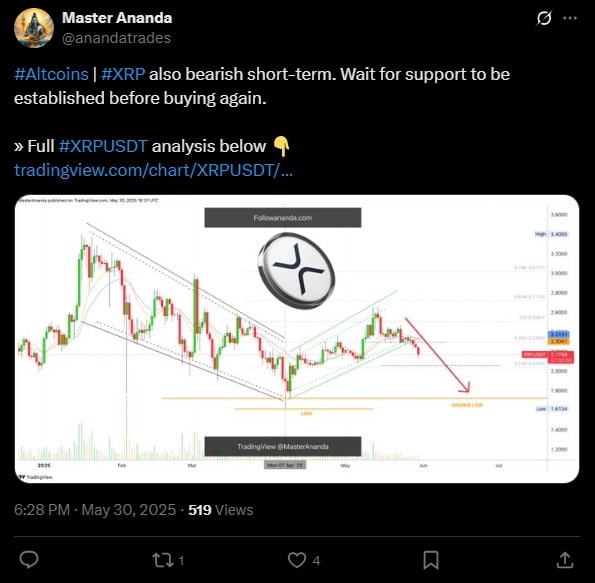 Master Ananda, ekspert platformy TradingView, zbadał obecne wykresy Ripple i ocenił, że „Pogłębiający się trend niedźwiedzi sugeruje, że faza korekty może się jeszcze nie zakończyć„. Ekspert wyliczył, że obecny poziom wsparcia dla XRP to obszar 1,60–1,85 USD.