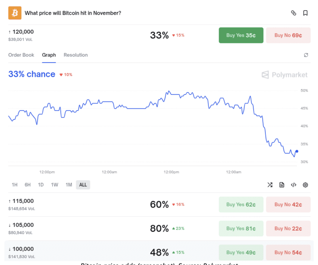 Na Polymarket szansa na zamknięcie listopada powyżej 120 000 dolarów wynosi jedynie 33%. Zatem rynek nie wierzy w gwałtowne odbicie, mimo że sezonowość zwykle działa na korzyść byków.