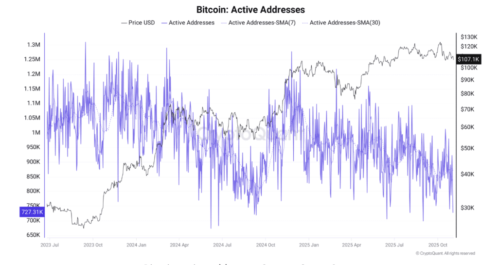 Liczba aktywnych adresów Bitcoin spadła z 1,18 mln do 872 tys. w ciągu roku. To ponad 26% mniej użytkowników, co pokazuje, że inwestorzy detaliczni wycofują się z rynku.