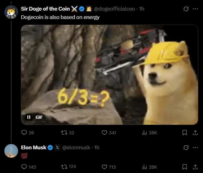W ten sposób CEO Tesli przypomniał swoje klasyczne stanowisko. Bitcoin ma wartość, bo wymaga realnego nakładu energii, a nie politycznych decyzji. Chwilę później popularne konto Sir Doge of the Coin dodało: „Dogecoin też jest oparty na energii.” Musk odpowiedział jedynie emoji „100” i to wystarczyło, by fani DOGE ruszyli do akcji. Post zdobył tysiące udostępnień, a polityk Matt Gaetz nawet zapytał: „Czy Dogecoin właśnie staje się globalnym tokenem użytkowym?!”