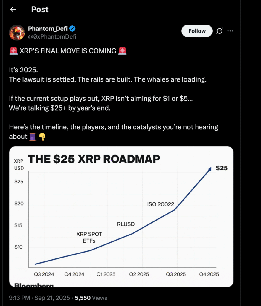 Phantom DeFi przewiduje, że XRP może przekroczyć 25 dolarów do końca roku. Nazywa to „ostatecznym ruchem” w cyklu. Podczas gdy niektórzy analitycy pozostają konserwatywni i stawiają sobie za cel 5 USD, inni uważają, że XRP może stworzyć nowych milionerów przed 2026 rokiem.