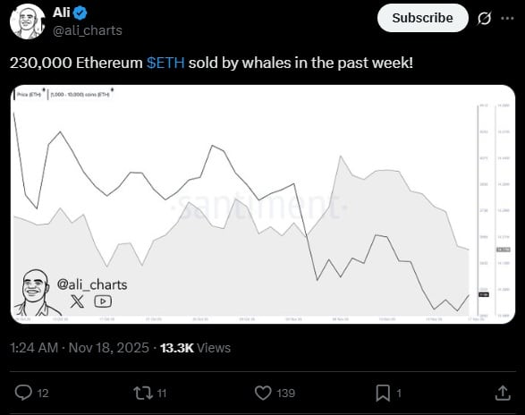 W jednym z najnowszych postów na X Ali Martinez poinformował, że wieloryby w poprzednim tygodniu sprzedały 230 tys. ETH. To oznacza, że panika rynkowa udzieliła się również posiadaczom tego tokena. Rozsądek podpowiada, że to zaledwie ułamek z prawie 121 mln tokenów w obiegu. Jednak rynek często kieruje się emocjami, a nie rozumem. Dlatego warto zachować czujność i obserwować, czy ten trend się nie nasila.
