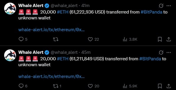 Wśród nich uwagę przykuwają m.in. dwa transfery z BitPanda. Jeden wieloryby dokonał dwóch transakcji, każda po 20 tys. ETH, przeniesienia tokenów z giełdy kryptowalut na prywatne portfele. To sugeruje, że duzi posiadacze nie widzą potrzeby sprzedawania Ethereum, ale wolą przechować je w bezpieczniejszym miejscu, niż giełdy.