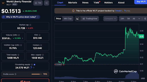 Token WLFI ma obecnie kapitalizację rynkową wynoszącą 3,72 miliarda dolarów, co plasuje go na 43. miejscu wśród kryptowalut, według CoinMarketCap. Pomimo ceny o 53,5% niższej od historycznego maksimum wynoszącego 0,46 dolara, kupujący postrzegają niedawne odbicie jako oznakę rosnącego zaufania do projektu. Platforma WLFI ma na celu świadczenie zdecentralizowanych usług finansowych w ramach ekosystemu World Liberty Financial, z funkcjami koncentrującymi się na pożyczkach, stakingu i płatnościach cyfrowych.