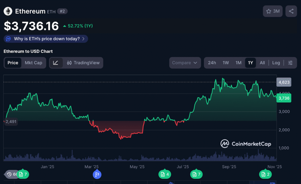Ethereum nadal przewyższa oczekiwania w 2025 r. ETH zbliża się do 3700 USD i notuje 52% wzrostu rocznego.