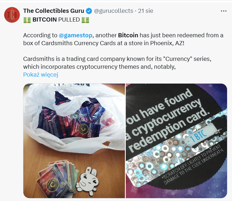 Trafiłeś kiedyś „dychę” w paczce Lay’sów za dzieciaka? Tutaj historia jest podobna, tylko zamiast dychy jest ponad 100 000 dolarów. Pewien kolekcjoner z Arizony kupił w GameStopie paczkę kart Cardsmith’s Currency za niecałe 13 dolarów. Zamiast zwykłej kolekcjonerskiej błyskotki znalazł tam coś, co zmienia życie – kartę wartą pełnego Bitcoina, czyli w przeliczeniu około 115 tysięcy dolarów.