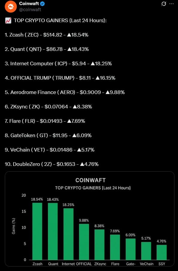 Zcash rośnie o ponad 200% i jest liderem wzrostów