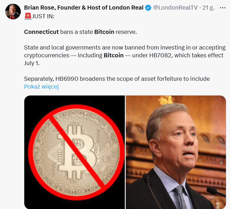I trudno nie przyznać mu racji, gdy spojrzymy na to, co robią inni. Teksas właśnie przeznaczył 10 milionów dolarów na zakup BTC do swojej strategicznej rezerwy. Arizona i New Hampshire poszły w tym samym kierunku. Stany Zjednoczone idą w stronę cyfrowych aktywów. Connecticut wybrało zupełnie inną ścieżkę. Może z przekory. Może z ostrożności. Być może z powodu polityki.