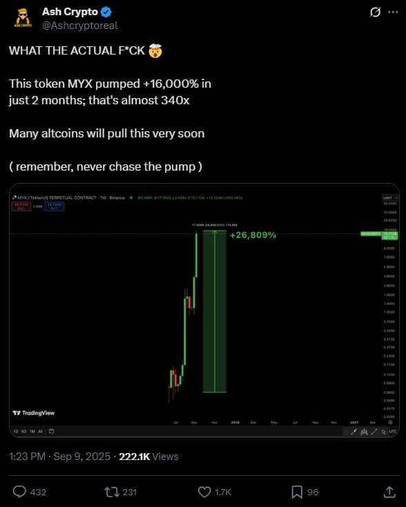 MYX to natywny token giełdy MYX Finance. Niektórzy eksperci wskazują, że to wynik tego, że moneta trafiła na duże giełdy kryptowalut, m.in. na Binance. Ponadto na giełdzie MYX pojawił się również token WLFI, za którym stoi fundusz powiązany z Donaldem Trumpem. Ponadto na koniec września zapowiedziano dużą aktualizację MYX, która