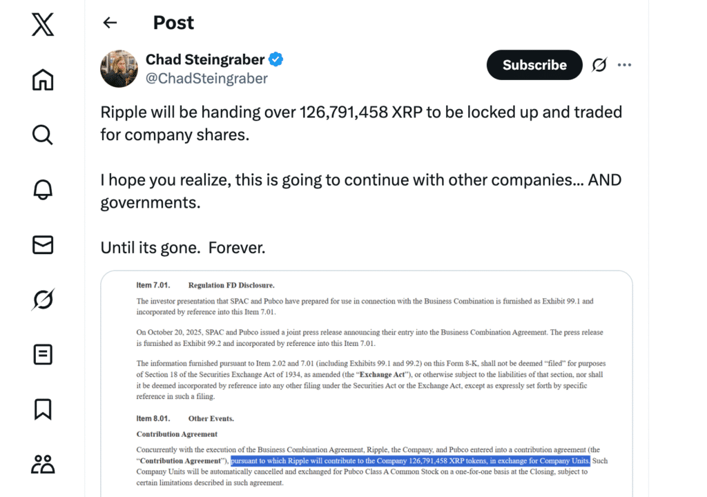 Ripple ma przekazać 126 791 458 tokenów XRP w ramach dużej transakcji korporacyjnej. Szczegóły ujawniono w niedawny zgłoszeniu do regulatora związanym z fuzją Evernorth Holdings–Armada Acquisition Corp. II.