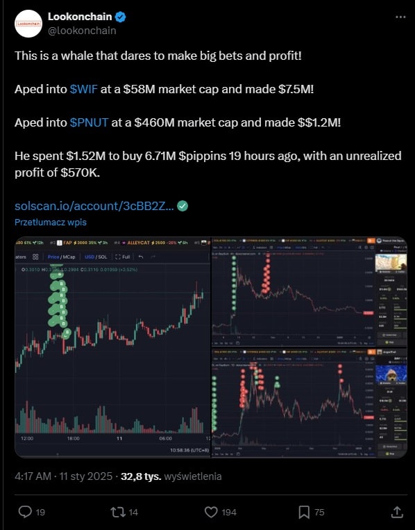 Znany inwestor kryptowalutowy, który wcześniej zarobił fortunę na memecoinach takich jak Dogwifhat (WIF) i Peanut the Squirrel (PNUT), tym razem zainwestował 1,5 miliona dolarów w Pippin, najnowszy memecoin na blockchainie Solana. Według danych Nansen, inwestor osiągnął już niezrealizowany zysk w wysokości 600 tysięcy dolarów.
